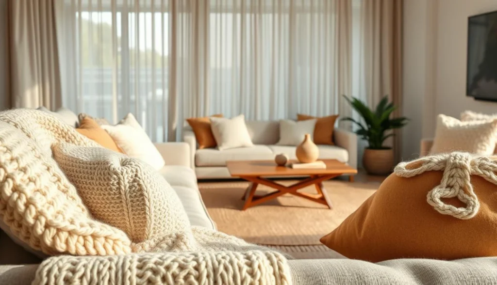 Escolher cortinas e mantas macias eleva o conforto da sala. Eles também são fáceis de trocar ou atualizar. Isso permite renovar a decoração sem gastar muito.